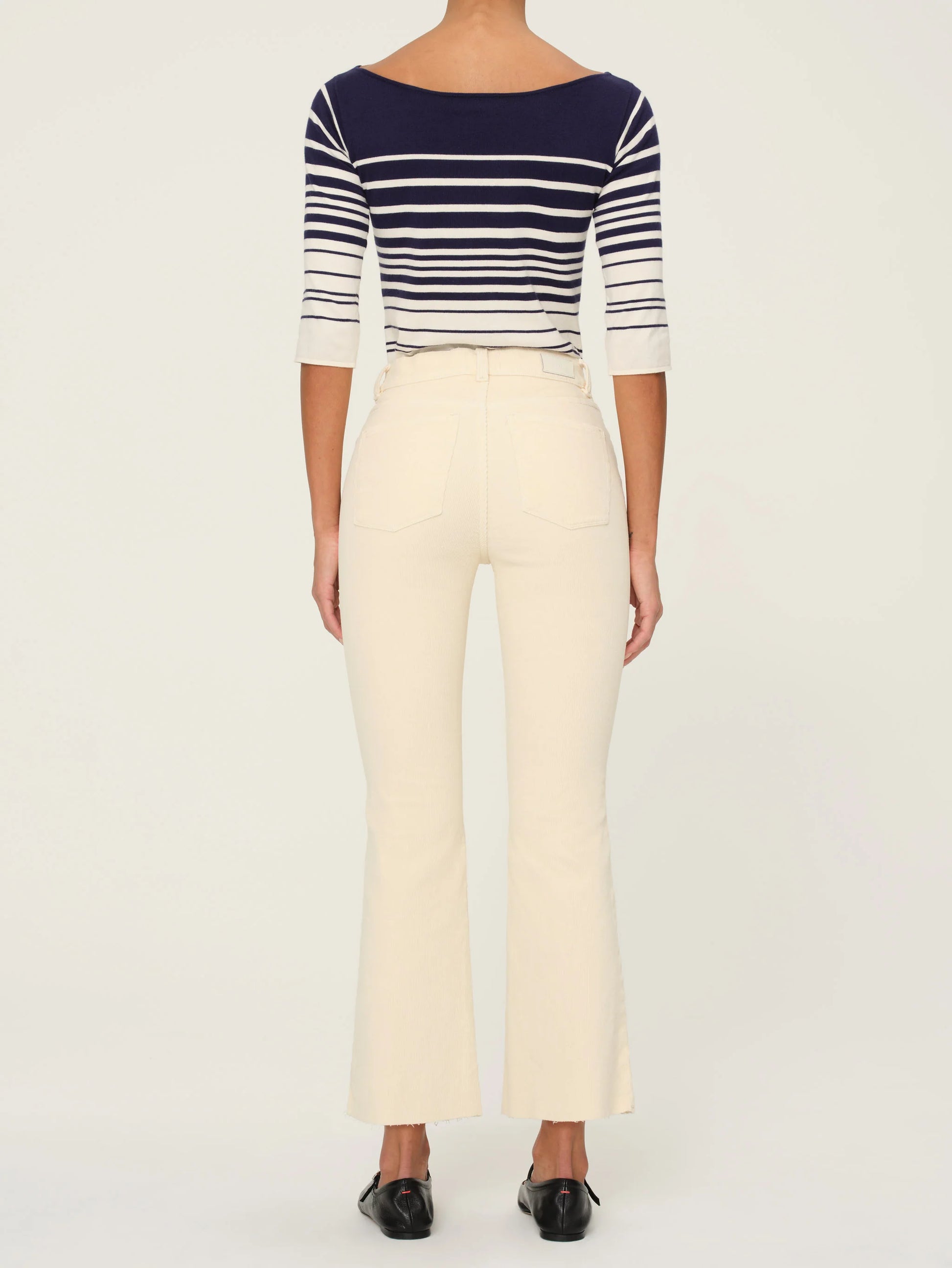 Manilla is an off-white corduroy. It features silver hardware, tonal stitching, raw hem and an ecru back patch.