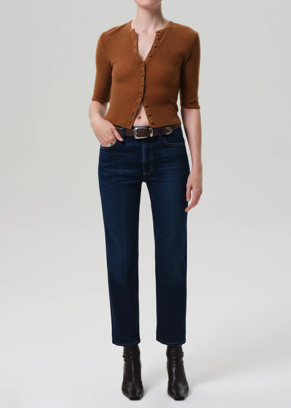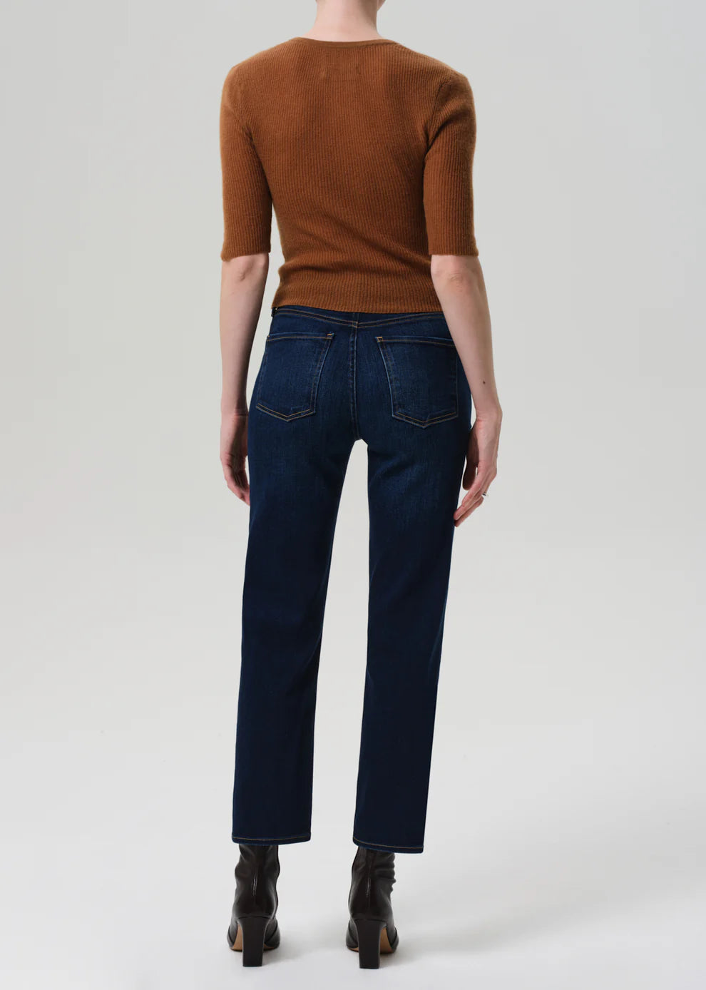 The Caia is a high-rise straight leg designed for everyday ease, crafted from soft stretch denim with a lightweight, flexible feel. The streamlined silhouette sits high on the waist and falls to an ankle-skimming length. The Dakota wash—a dark to medium indigo with subtle fading and whiskering—offers a polished, versatile look. Perfect paired with crisp shirting or easy knits.