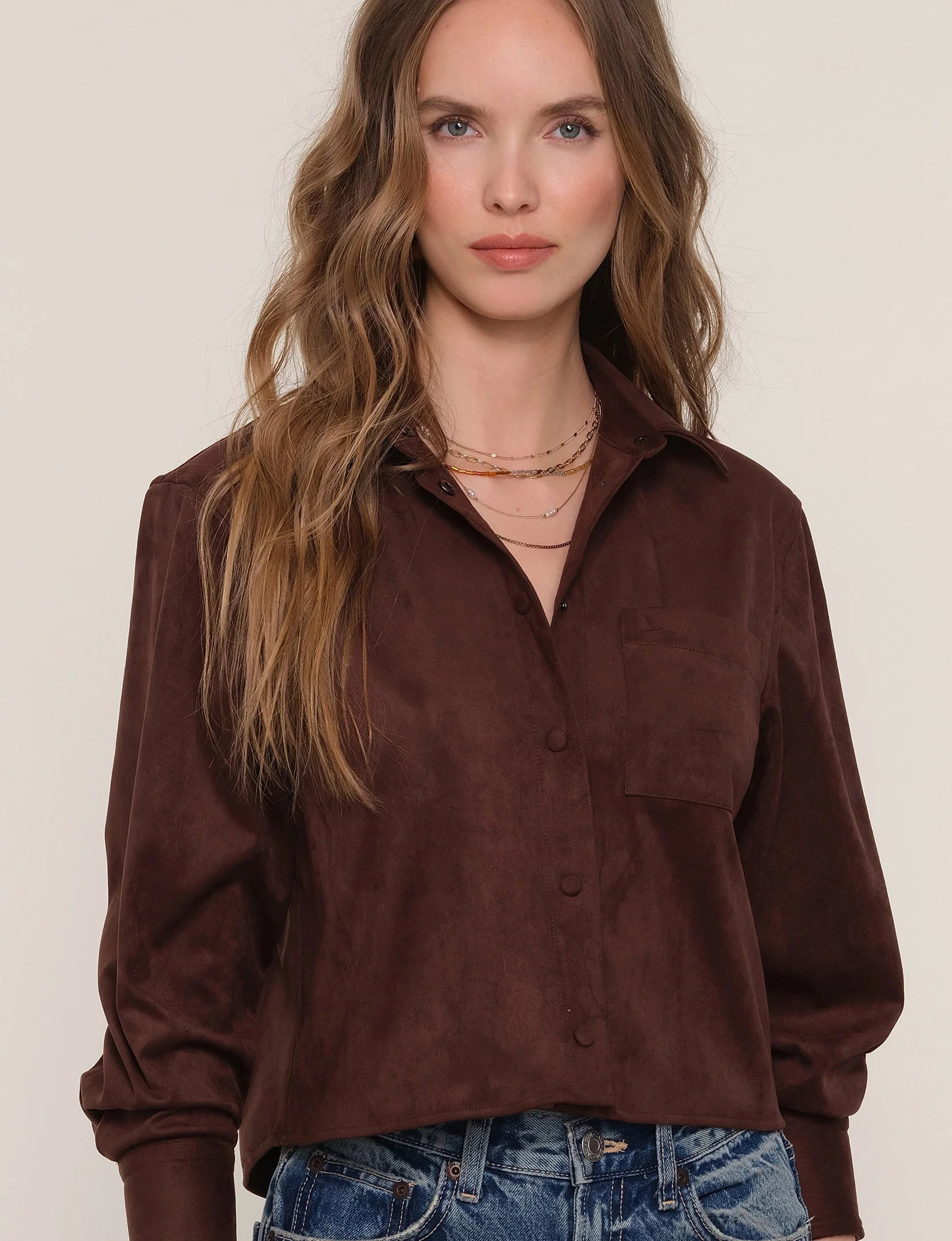 The Castalia Top is a classic, cropped, button down shirt. It has a relaxed fit and is made from a super soft, faux suede. Wear it open over a tank or closed with a pair of high waist jeans.