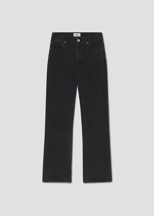 A flattering high-rise flare with an elongated leg, the Leena is cut from rigid, non-stretch denim crafted with organic and recycled fibers for a structured yet soft feel. This pair is finished in a washed-out black with warm undertones and subtle fading for a broken-in effect. Style with a crisp white tee or oversized blazer for a clean, tonal look.