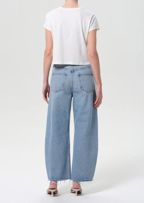 The Low Curve Fray is a summer-ready adaptation of the classic Low Curve Jean. Featuring a cropped inseam, this version is tailored for warmer weather, with a frayed hem that adds a laid-back, effortlessly chic touch. Crafted from regenerative cotton, the vintage marbled light indigo denim features fading, whiskering, and a frayed hem for a perfectly worn-in look. Pair with a relaxed tank and sandals for a casual summer vibe.