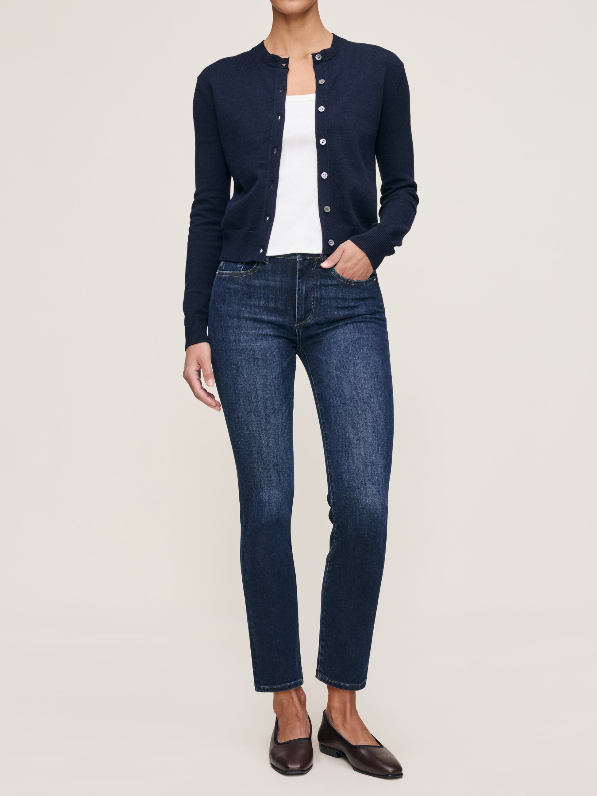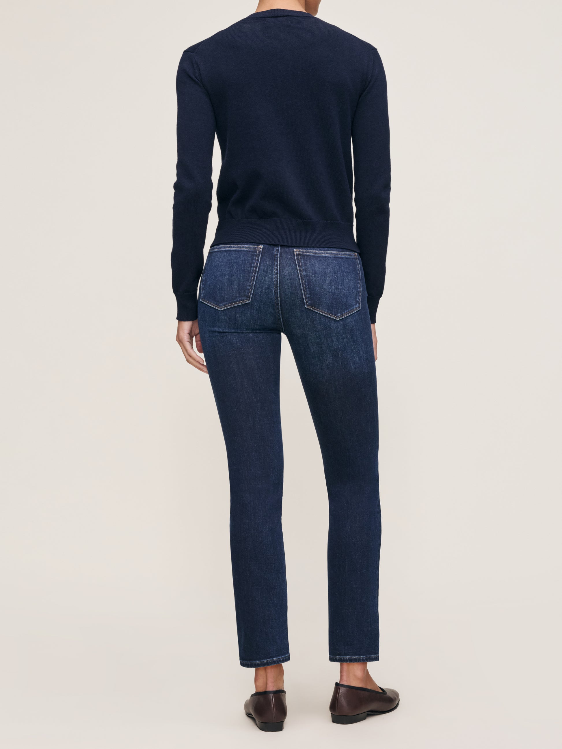 Mara is a mid-rise, ankle length straight leg fit that utilizes our Instasculpt™ technology to smooth, sculpt, and conform to your body for the perfect fit. Eastside is a dark indigo wash with subtle whiskering for a vintage look. It features gold hardware, khaki stitching, a clean hem and a black back patch.