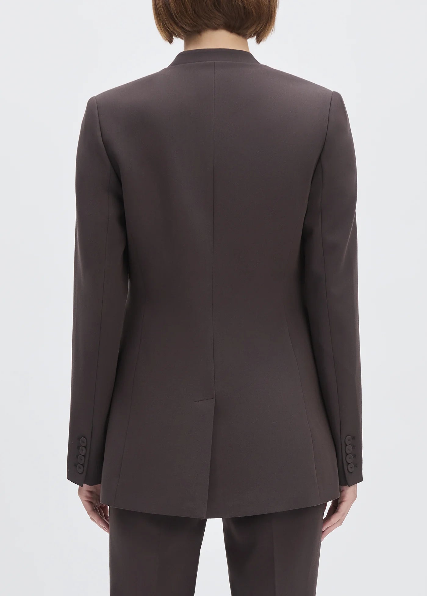 The Victoria Jacket does it differently. Collarless with a crew neckline, slanted pockets, and a slightly defined waist. Single-breasted with a front button closure, cut from a suiting blend that works any day of the week.